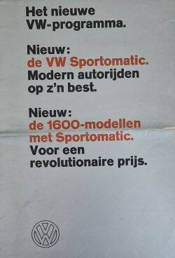 Name: Het nieuwe VW-Programma Nieuw: de VW Sportmatic. Modern autorijden op z'n best. Nieuw: de 1600-modellen met Sportmatic. Voor een revolutionaire prijs.